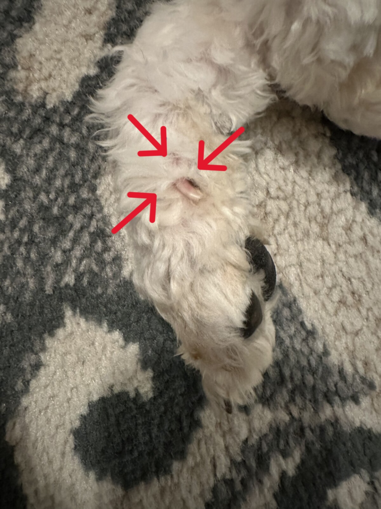 발바닥에서 약 5cm 정도 위쪽, 털 속 깊은 곳에 작게 자리하고 있더라구요.